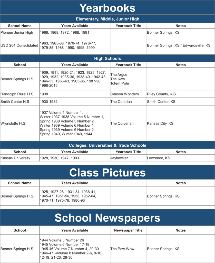Each date listed is linked to a PDF version of the Bonner Springs High School yearbook. Feel free to click on the date to view the yearbook for that year.